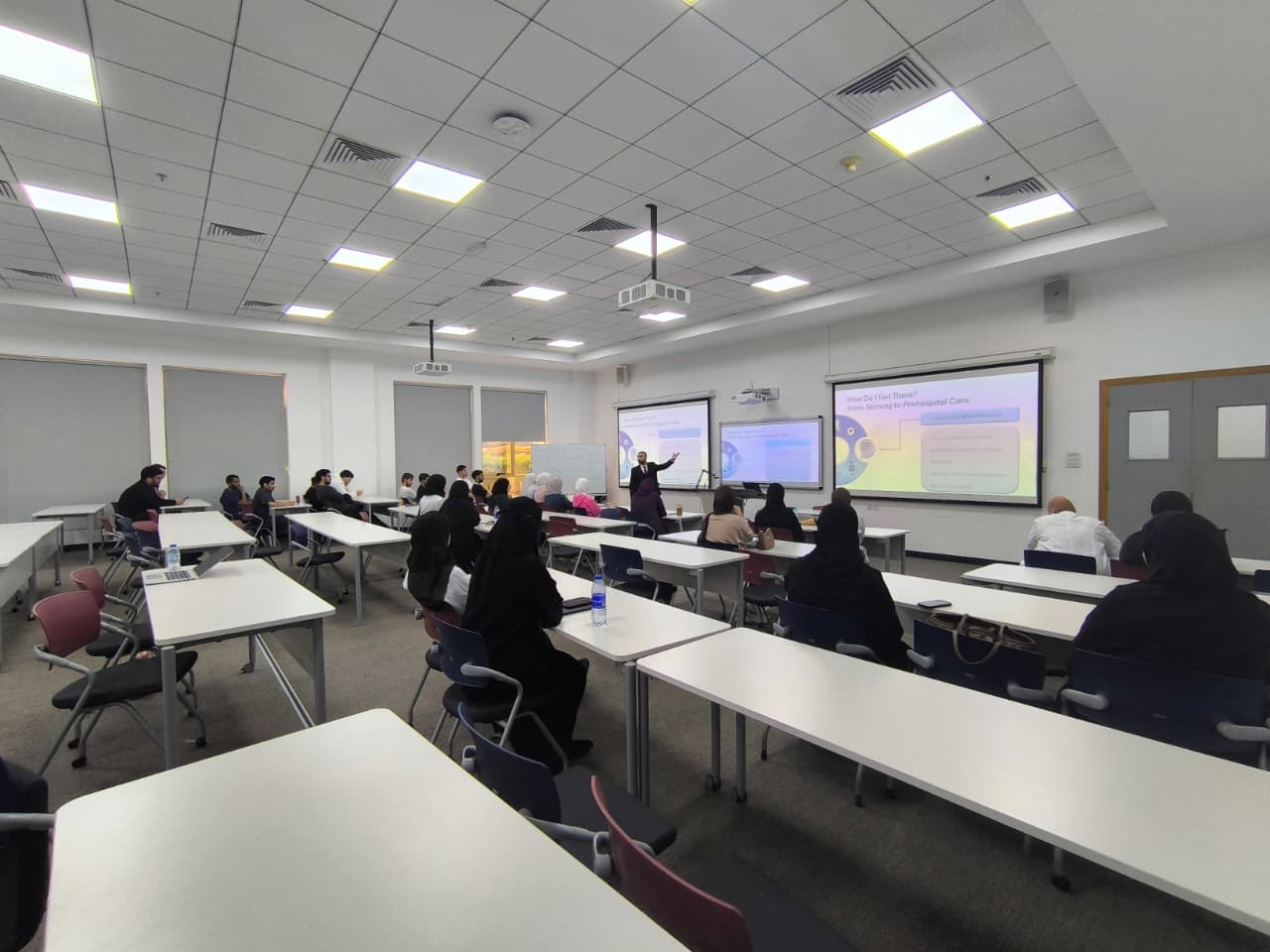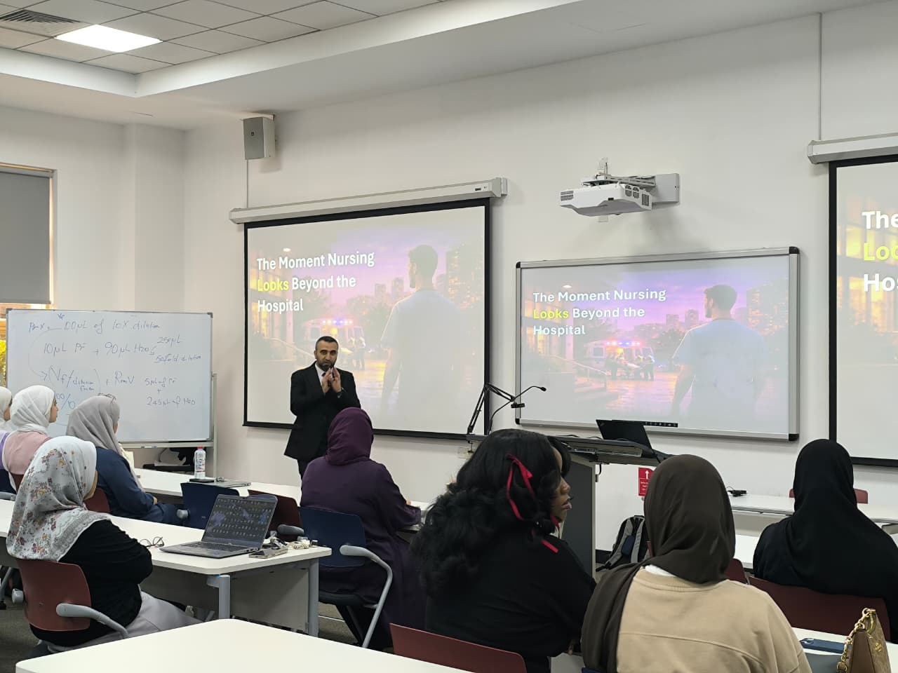 The session, titled “Career Beyond Hospitals: Exploring Prehospital Care for Nursing Students” was delivered by Ajman University’s guest speaker Mr. Baha Mustafa, Operation Manager from the National Ambulance. In his speech, Mr. Mustafa explained the difference between nursing and paramedics in prehospital field drafting from real case scenarios, supported by his dual background as an Intensive Care Unit and Emergency nurse and later as a paramedic. Students were then introduced to the process of acquiring certificates as an Emergency Medical Technician or Paramedic in the UAE, and engaged with an interactive Quessions & Answers session at the end.